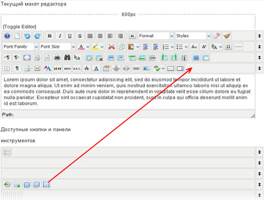 двигаемся вниз и в появившихся окнах необходимые кнопки просто перетягиваем в Текущий макет редактора и обратно...