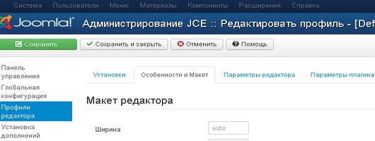 По умолчанию все глобальные настройки должны подходить. Можно по желанию установить группы пользователей для редактора. Настройка панели редактора JCE происходит по тому же пути: КОМПОНЕНТЫ - Редактор JCE - профили.