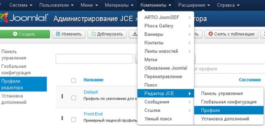 После установки и настройки в СИСТЕМА - ОБЩИЕ НАСТРОЙКИ сайта устанавливаем редактор JCE по умолчанию.